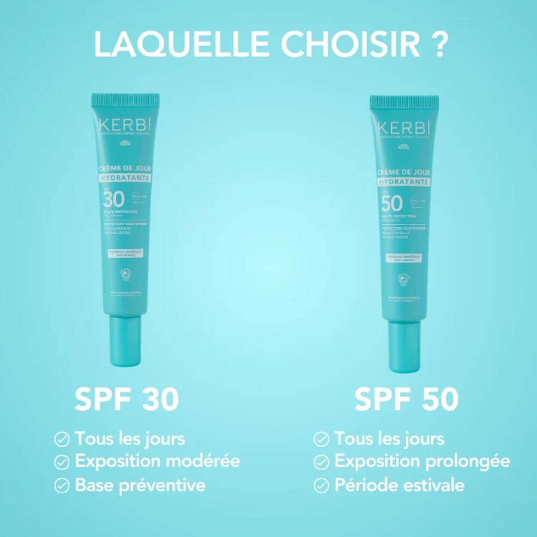 La crème solaire visage SPF30 bio Kerbi protège efficacement des rayons UVA et UVB tout en hydratant la peau en un seul geste quotidien. En effet, Kerbi formule ce soin 2-en-1 avec un filtre minéral à base d’oxyde de zinc, 100 % d’ingrédients d’origine naturelle, et deux actifs brevetés : la technologie Frametime® et la Vitamine D3-Like®.