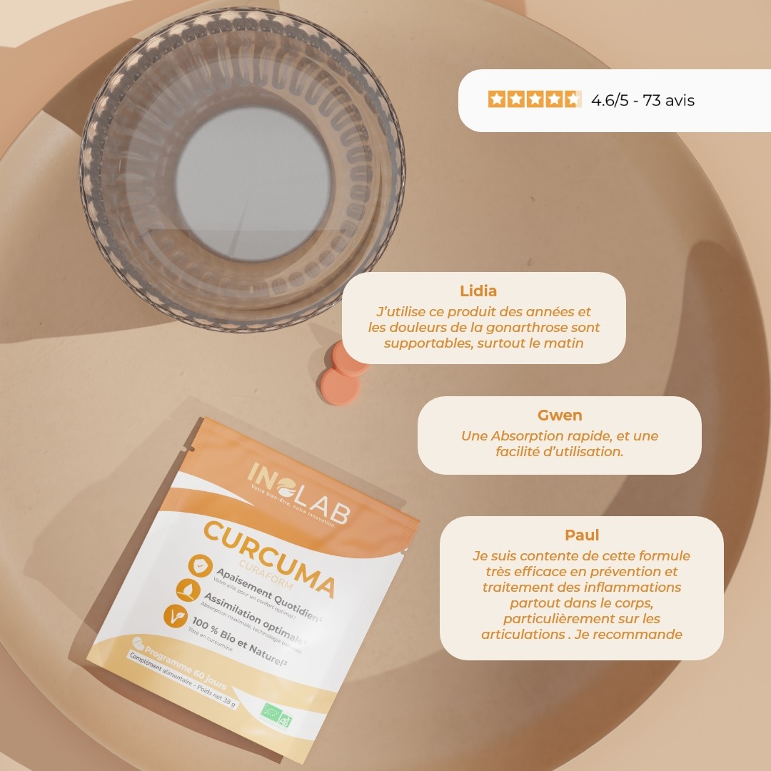 Découvrez CuraForm, notre complément alimentaire premium à base de curcuma bio titré en curcumine et formulé avec l’extrait breveté CurQfen®. Grâce à une assimilation optimisée et une diffusion prolongée jusqu’à 12h, ce curcuma nouvelle génération offre une efficacité renforcée par rapport aux extraits classiques.
