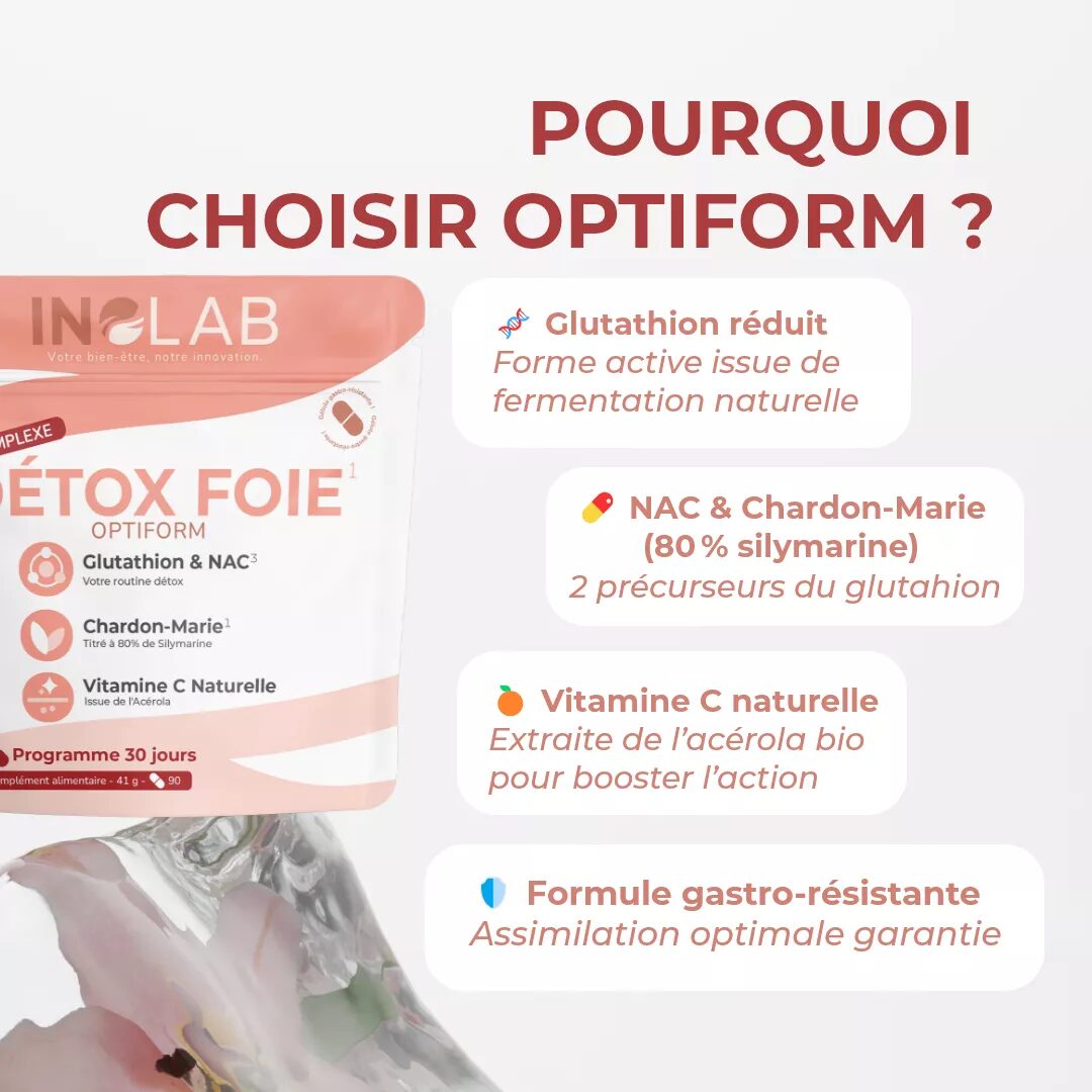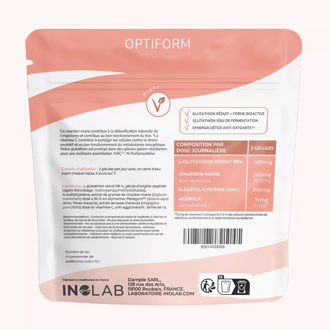 Glutathion réduit détox – OptiForm Inolab | NAC + Chardon-Marie 80 % + Vitamine C acérola | 90 gélules
