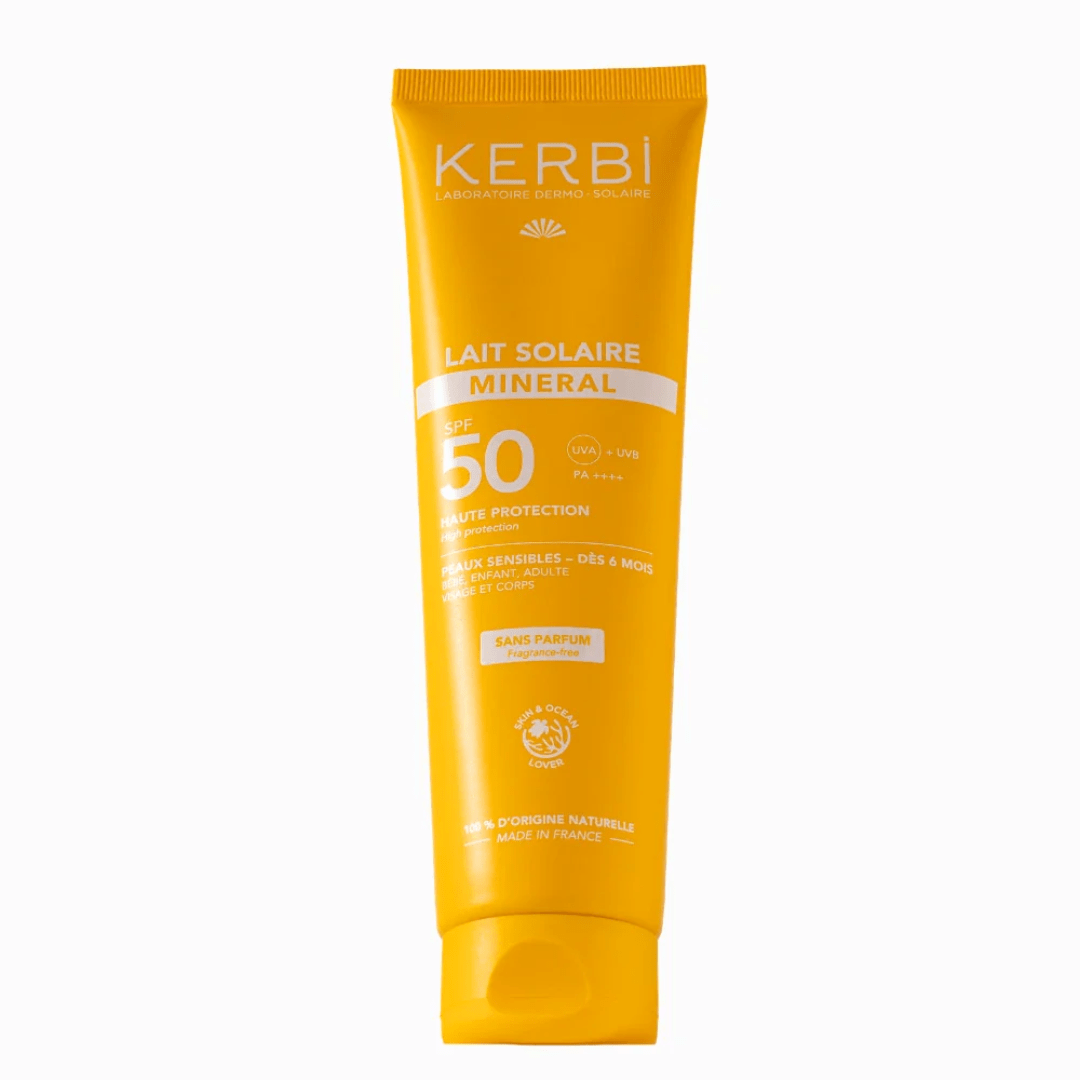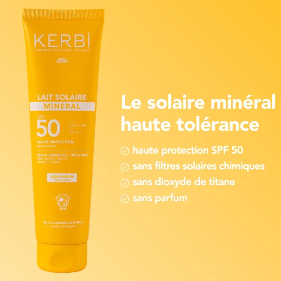 Le lait solaire minéral bébé SPF50 Kerbi protège toute la famille dès 6 mois grâce à un filtre 100 % minéral à base d’oxyde de zinc, sans parfum, 100 % d’ingrédients d’origine naturelle et certifié bio. En effet, Kerbi formule ce lait pour les peaux les plus sensibles — bébés, enfants, adultes, femmes enceintes et allaitantes — avec une haute tolérance cutanée et aucun filtre chimique.