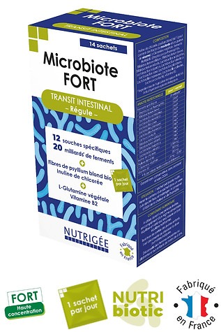 Microbiote Fort Nutrigée est un complément alimentaire conçu pour accompagner le bien-être intestinal et soutenir le transit grâce à une association de fibres, nutriments et ingrédients favorables à l’équilibre du microbiote.